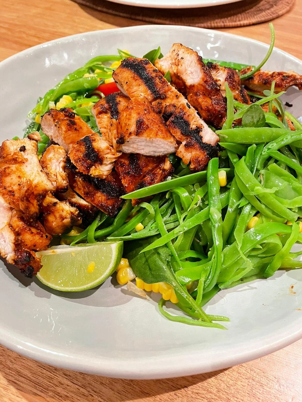 - Mix all the salad together in a little oil and salt and pepper then onto your serving platter. Place the chicken over the top and a good squeeze of lime.